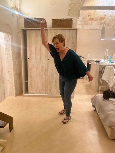 All were picturesque, stony...and dastardly. (As I've noted, even the cave accommodations in Matera that we loved had their perils. And the one in Rome where we'd stayed after flying overnight had a platform shower parked right inside the bedroom itself. It was poorly lit, slippery, and had dark, psychedelic lights -- so dark you couldn't see the indications on the confusing shower apparatus. The door opened from the outside so you had to force your way back out of the shower after a brief panic. Finally, there was a coffee maker placed just downstairs from the "head-diving platform" with a steel bar sticking straight up on which to impale oneself en route to face planting in the hot coffee.)